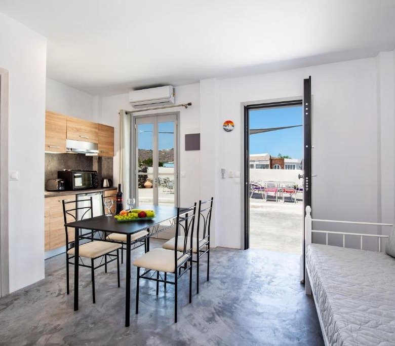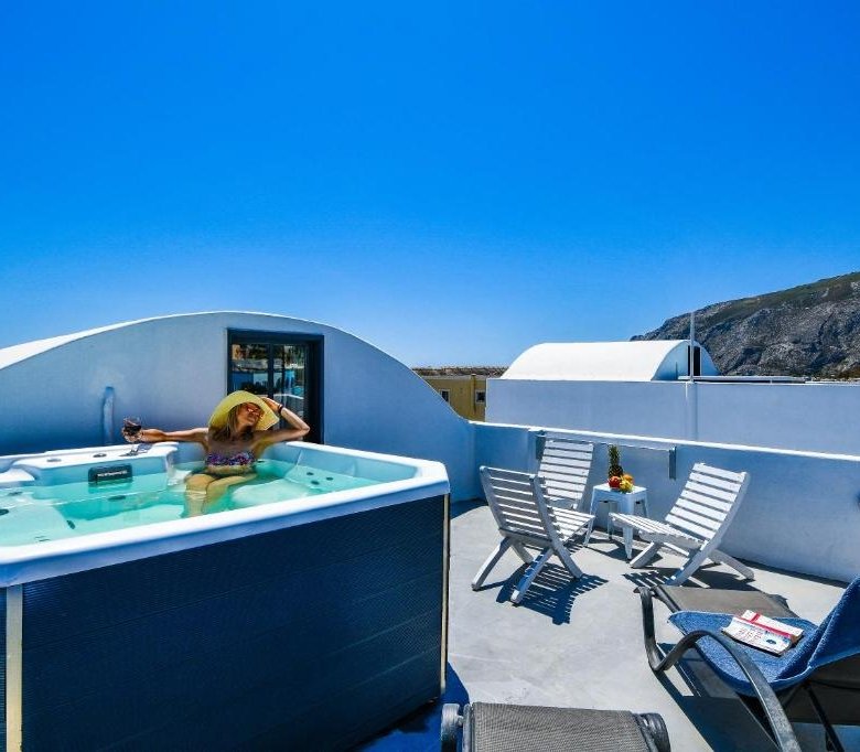 4 σουίτες 40 τ.μ. (1ος–2ος): κουζίνα, μπάνιο, διπλό κρεβάτι, βεράντα με ιδιωτικό τζακούζι, απεριόριστη θέα.