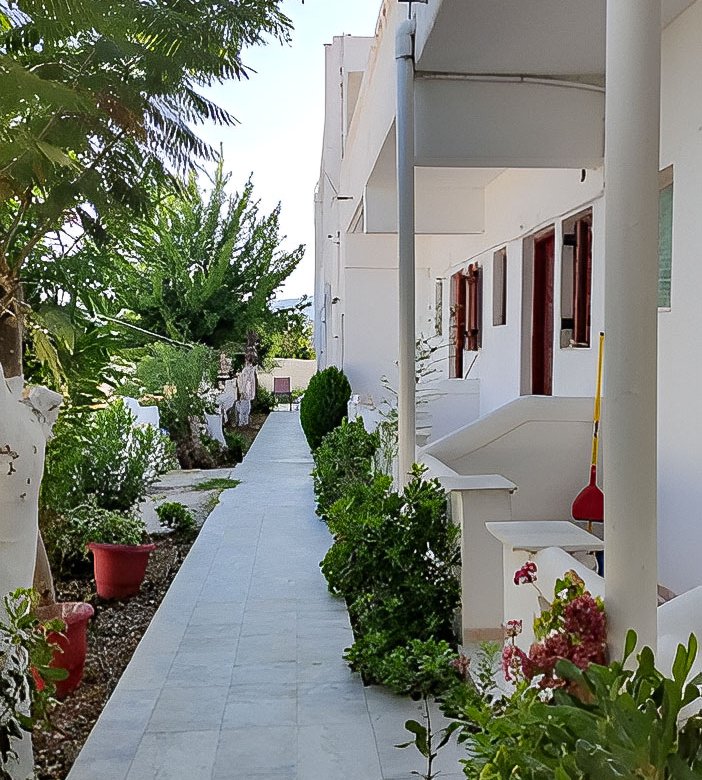 – Ισόγειο 313,39 τ.μ.: 9 διαμερίσματα φιλοξενίας έως 4 ατόμων, όλα με κουζίνα, μπάνιο και ευρύχωρα μπαλκόνια με θέα προς τη Χώρα. Επιπλέον, 2 αποθήκες συνολικής επιφάνειας 15 τ.μ. και κλιμακοστάσια 23,13 τ.μ.